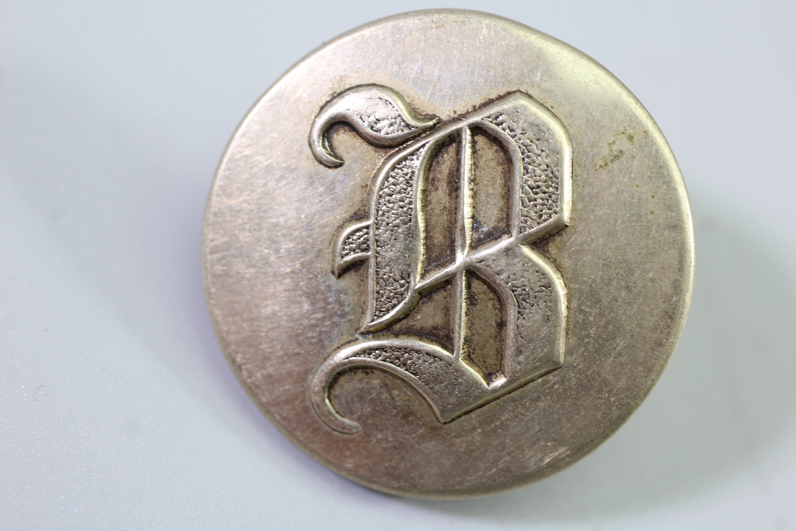2x original Metall Uniform Knopf Uniformknopf mit Monogramm Buchstabe B, erhaben herausgearbeitet. Bestand aus einer alten Uniformschneiderei