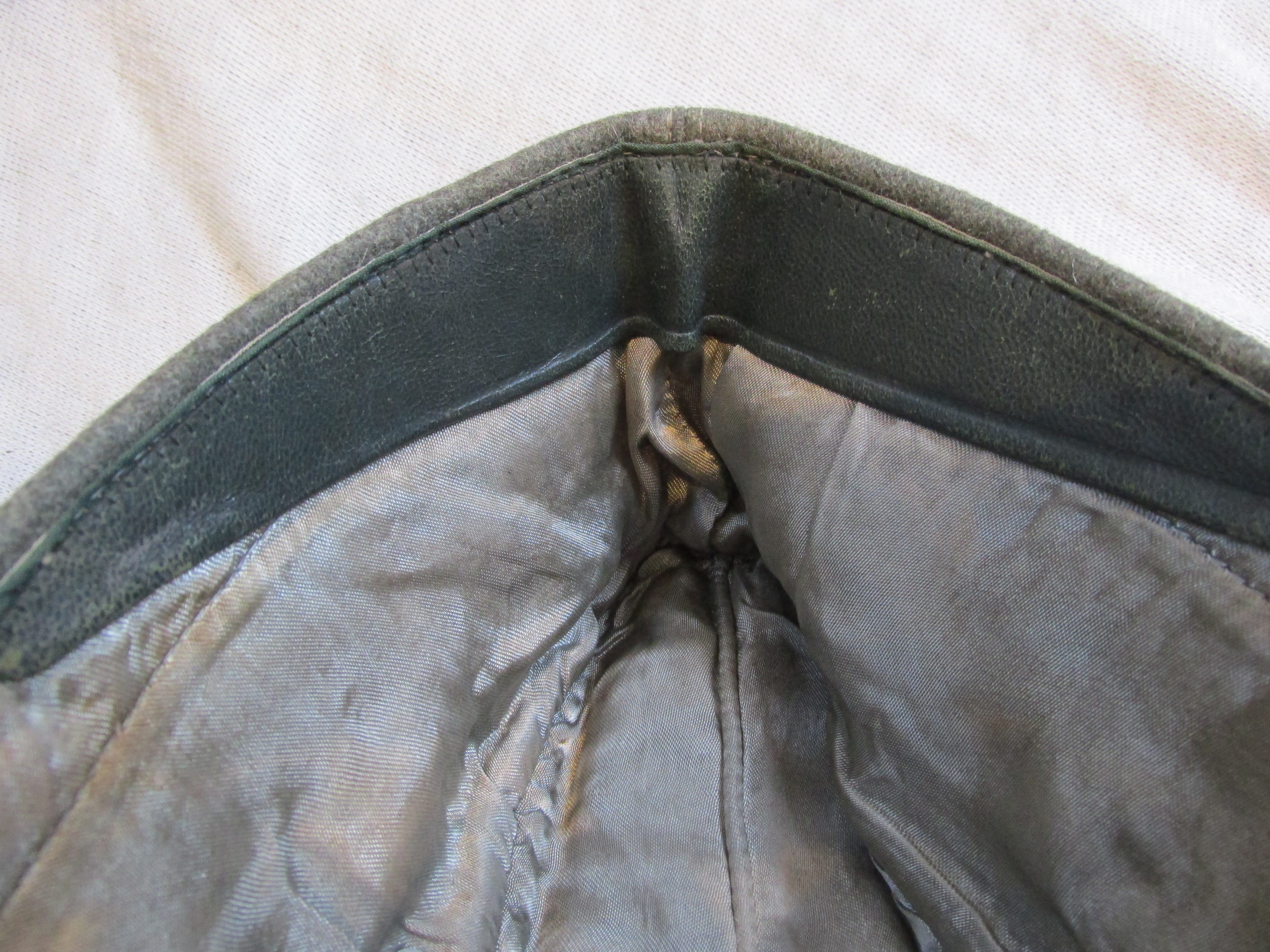 Fertigung aus feldgrauem Tuch, umlaufend mit silberner Paspelierung, bordeauxroter Soutachewinkel. Innen mit Seidenfutter und Schweißband, Kopfgrößenangabe "56". Sehr schöner Zustand.