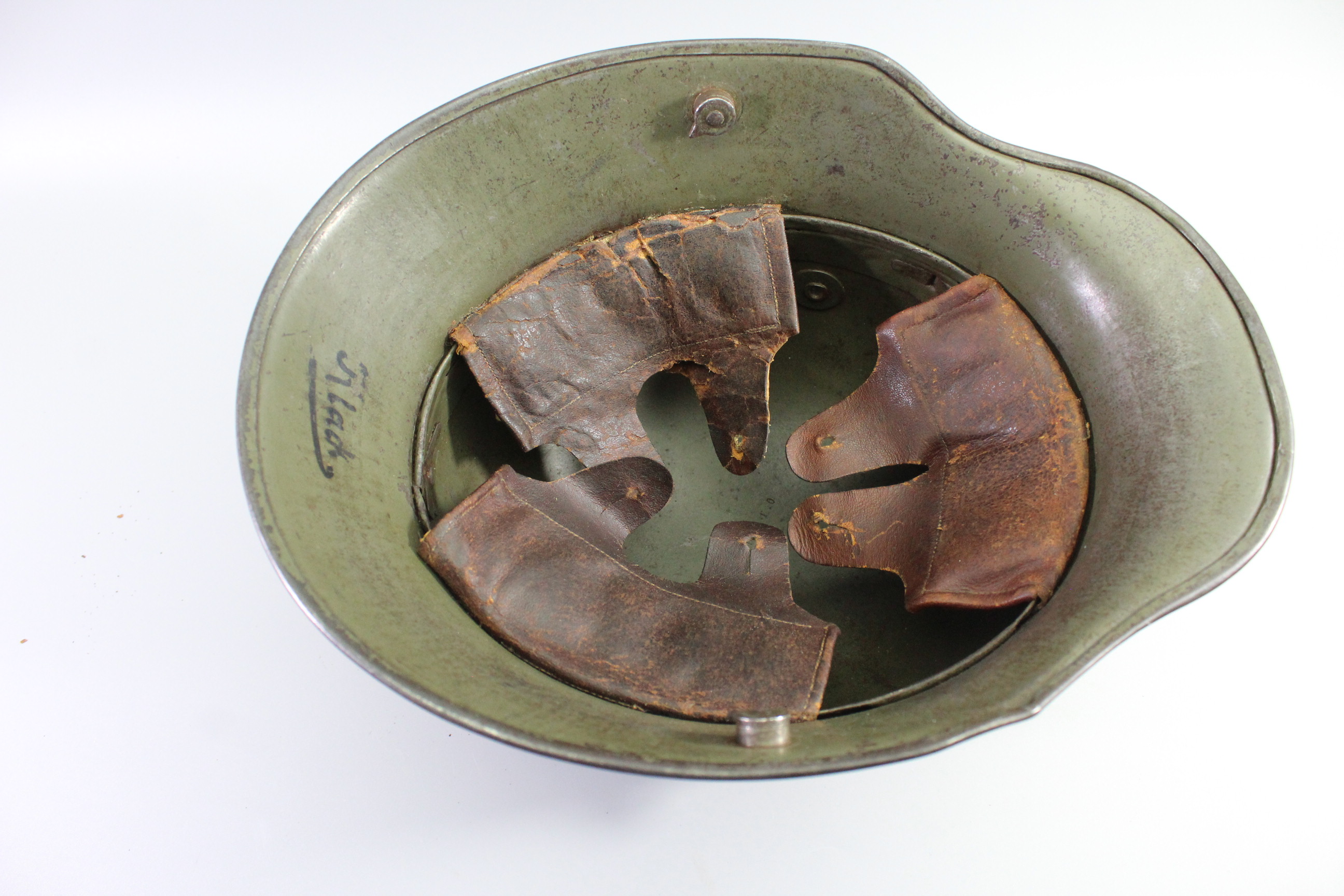 Der Helm überzeugt durch seine sehr schön erhaltene originale Lackierung sowie durch die vollständige Erhaltung der Rosshaarpolster. Die originale Substanz ist insgesamt stimmig und unverbastelt.