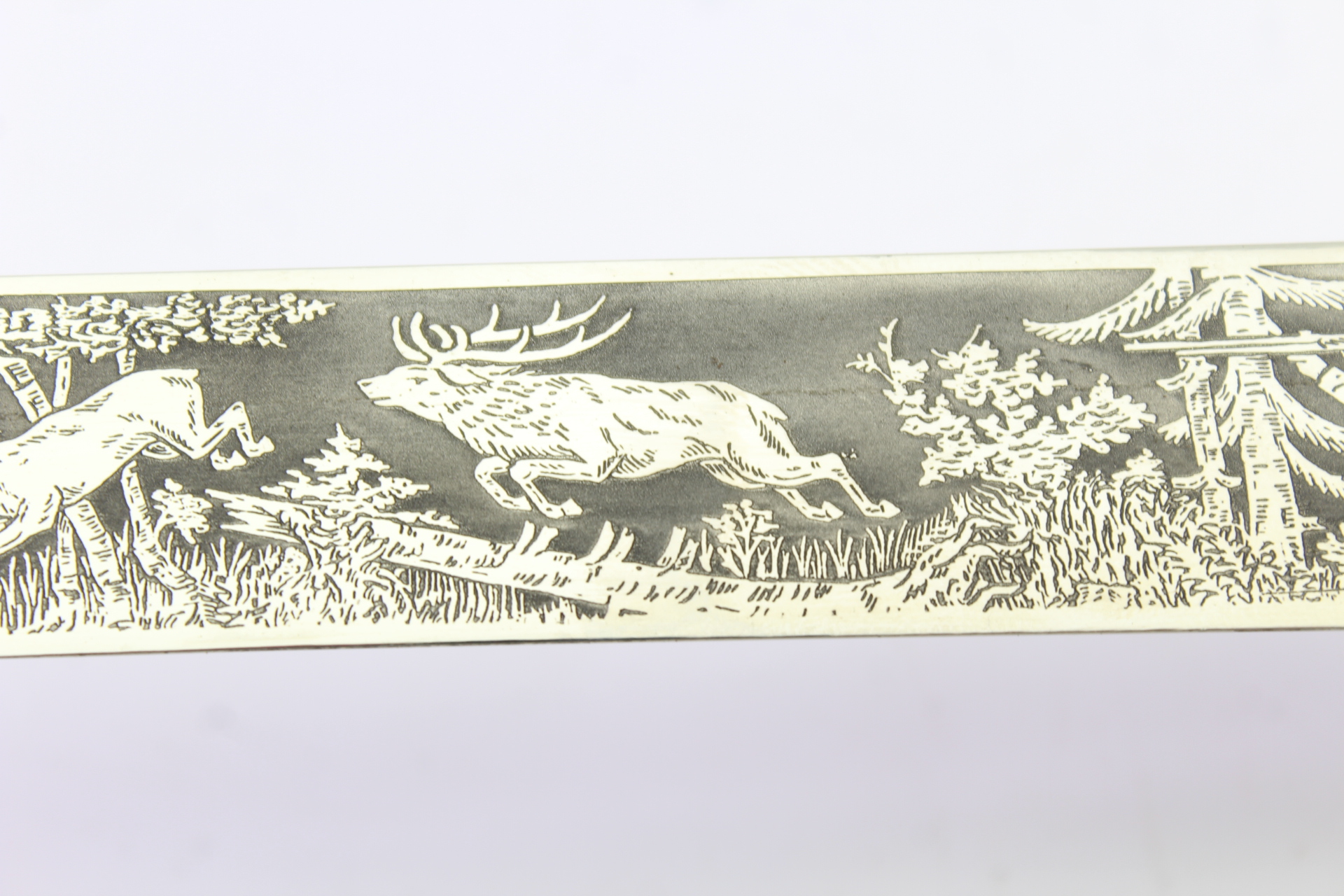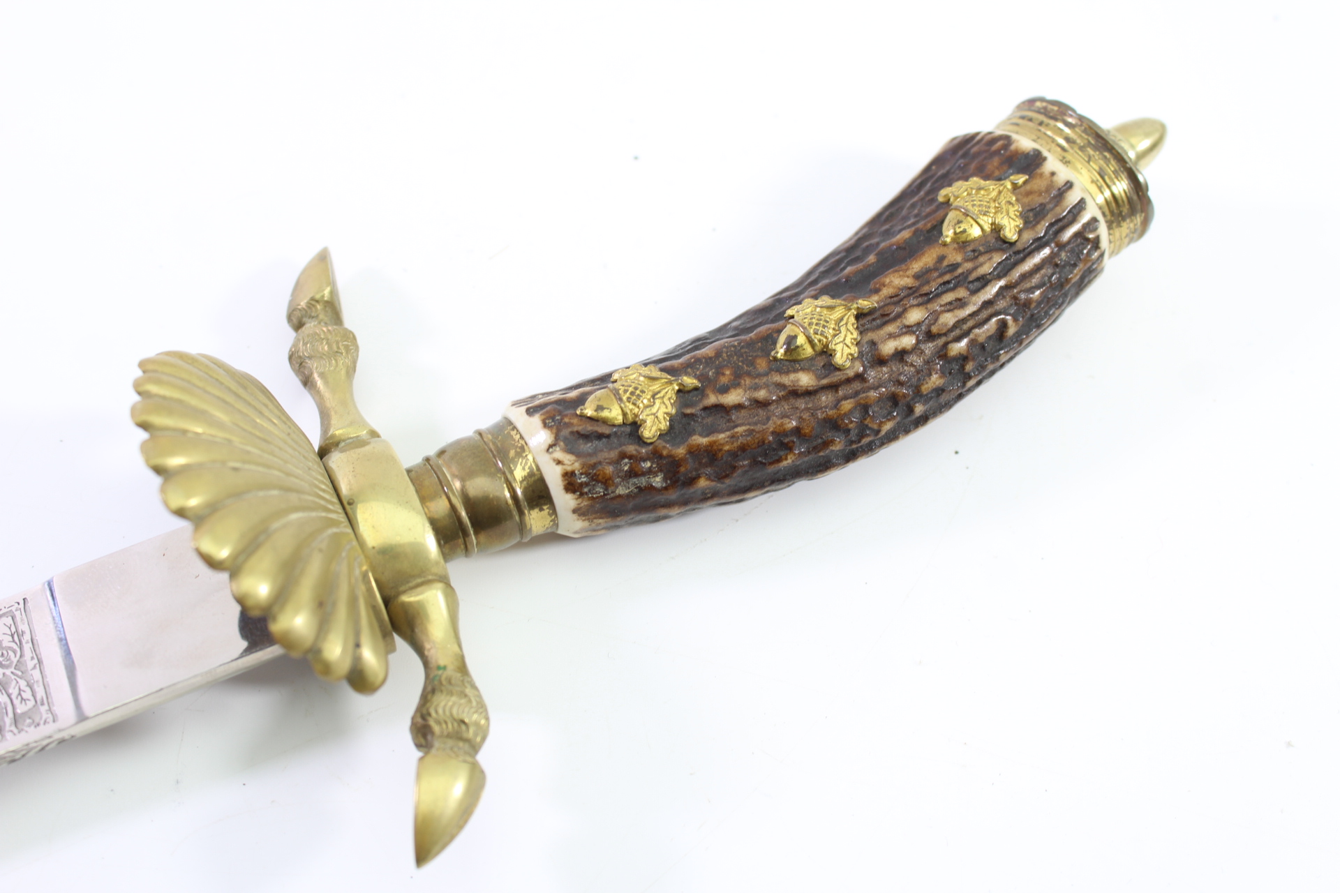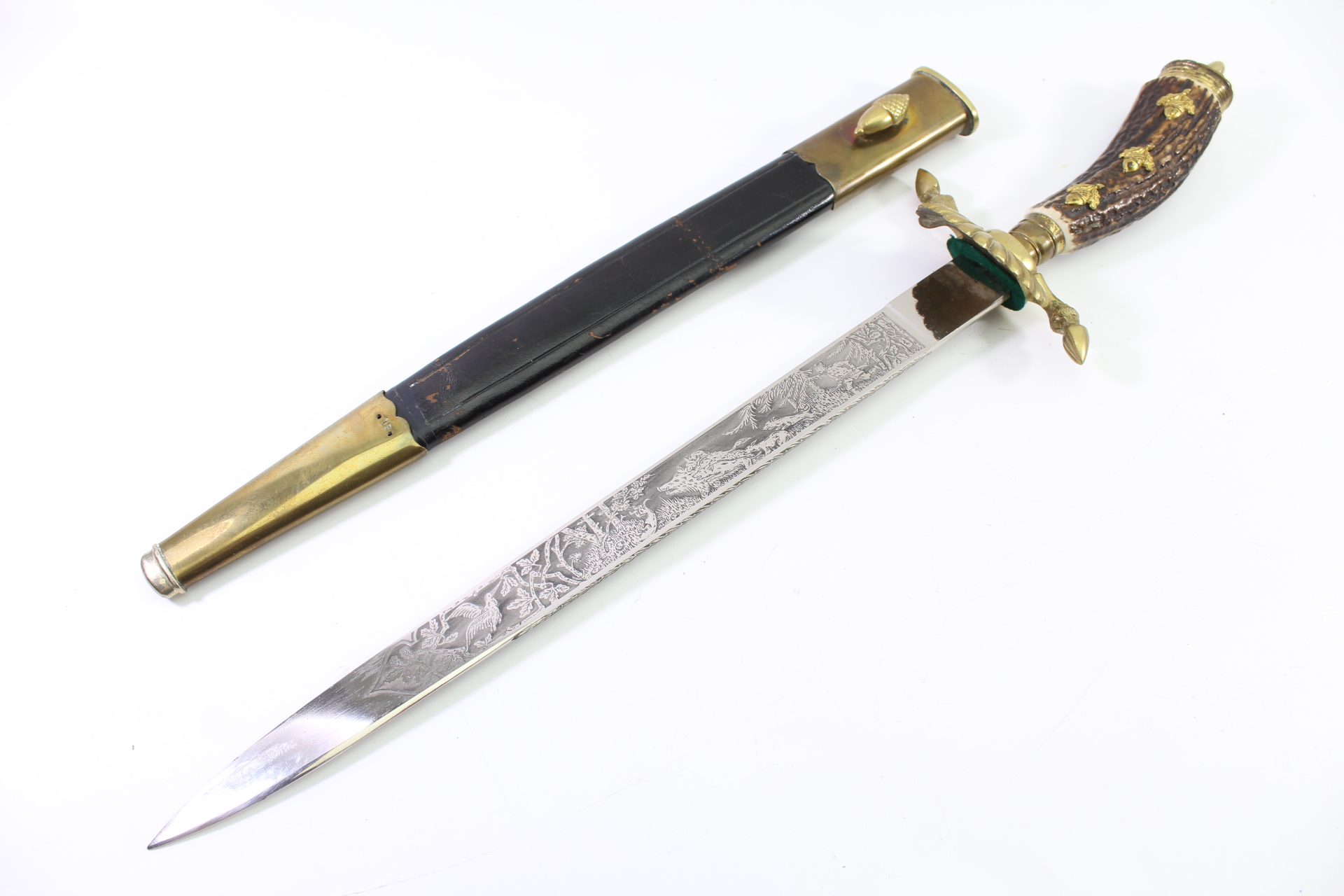 Hirschfänger mit Horngriff und Messingbeschlag. Horngriff mit 3 aufgelegten Eicheln, lange geätzte Rückenklinge, Klinge beidseitig mit feinem jagdlichen Ätzdekor. Lederscheide mit Messingbeschlägen, 1 Klammer fehlt. Länge ca 50 cm. Guter Zustand mit leichten Alters- und Gebrauchsspuren. Der Koppeltragehaken in Form einer Eichel ausgebildet. S-förmiges Parierstück in Rehläufen endend.
