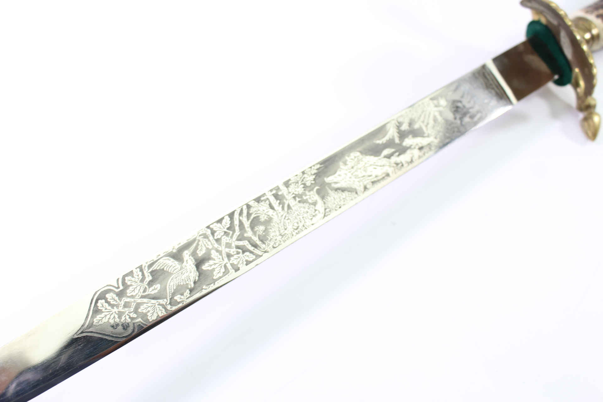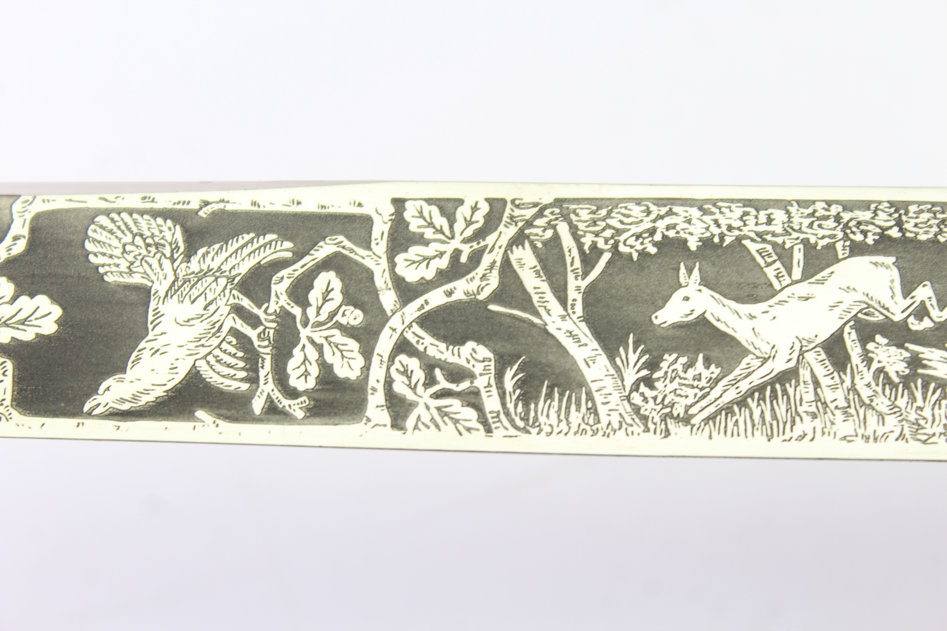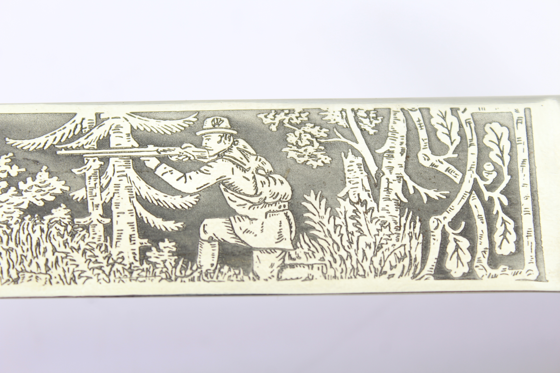 Hirschfänger mit Horngriff und Messingbeschlag. Horngriff mit 3 aufgelegten Eicheln, lange geätzte Rückenklinge, Klinge beidseitig mit feinem jagdlichen Ätzdekor. Lederscheide mit Messingbeschlägen, 1 Klammer fehlt. Länge ca 50 cm. Guter Zustand mit leichten Alters- und Gebrauchsspuren. Der Koppeltragehaken in Form einer Eichel ausgebildet. S-förmiges Parierstück in Rehläufen endend.