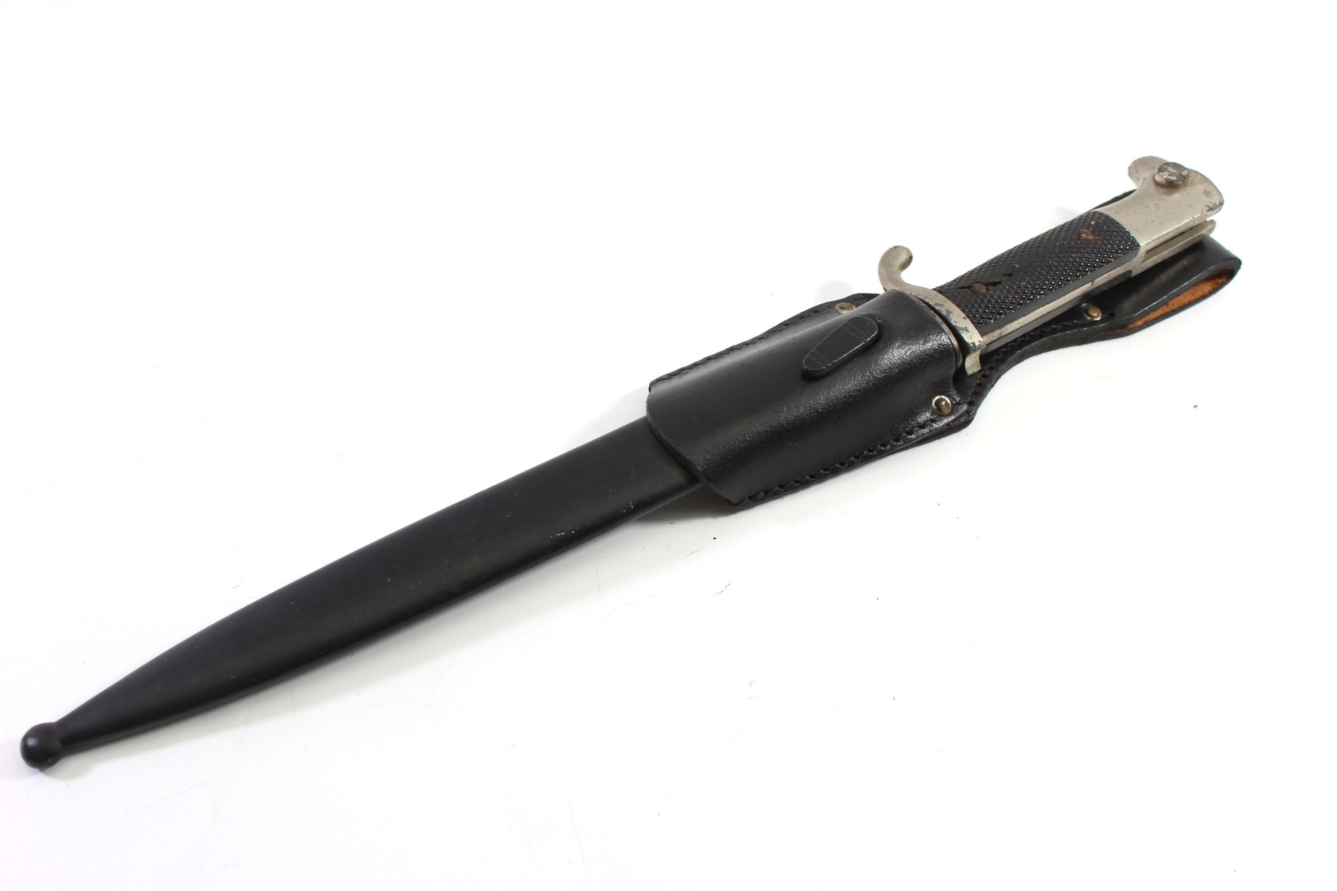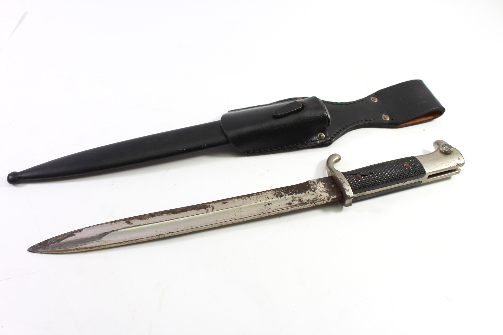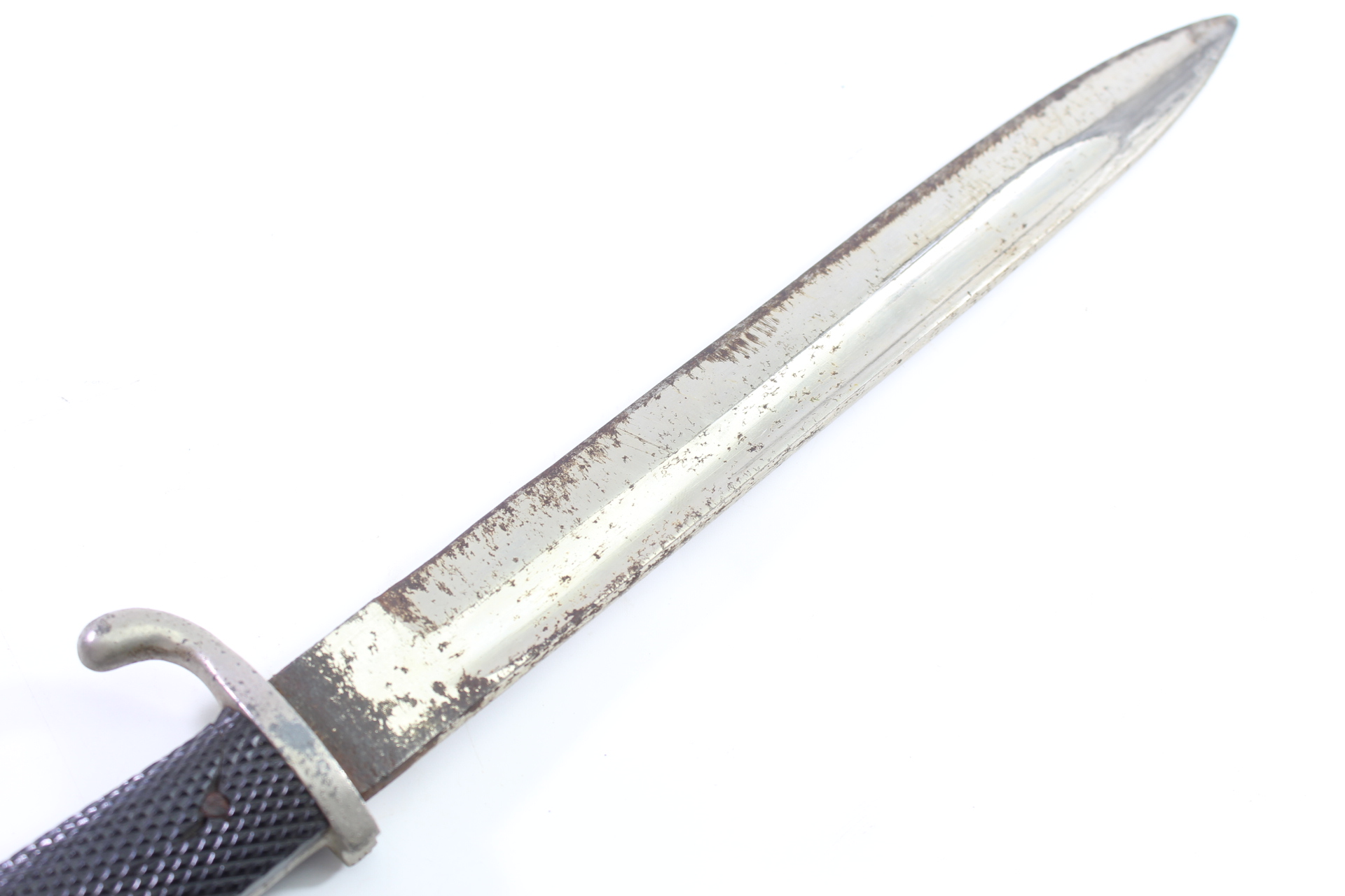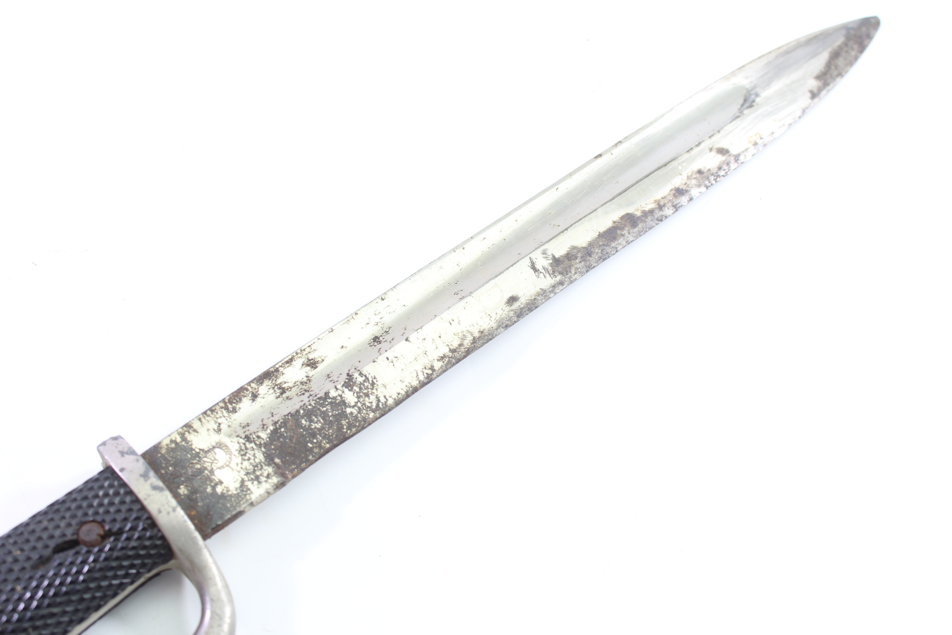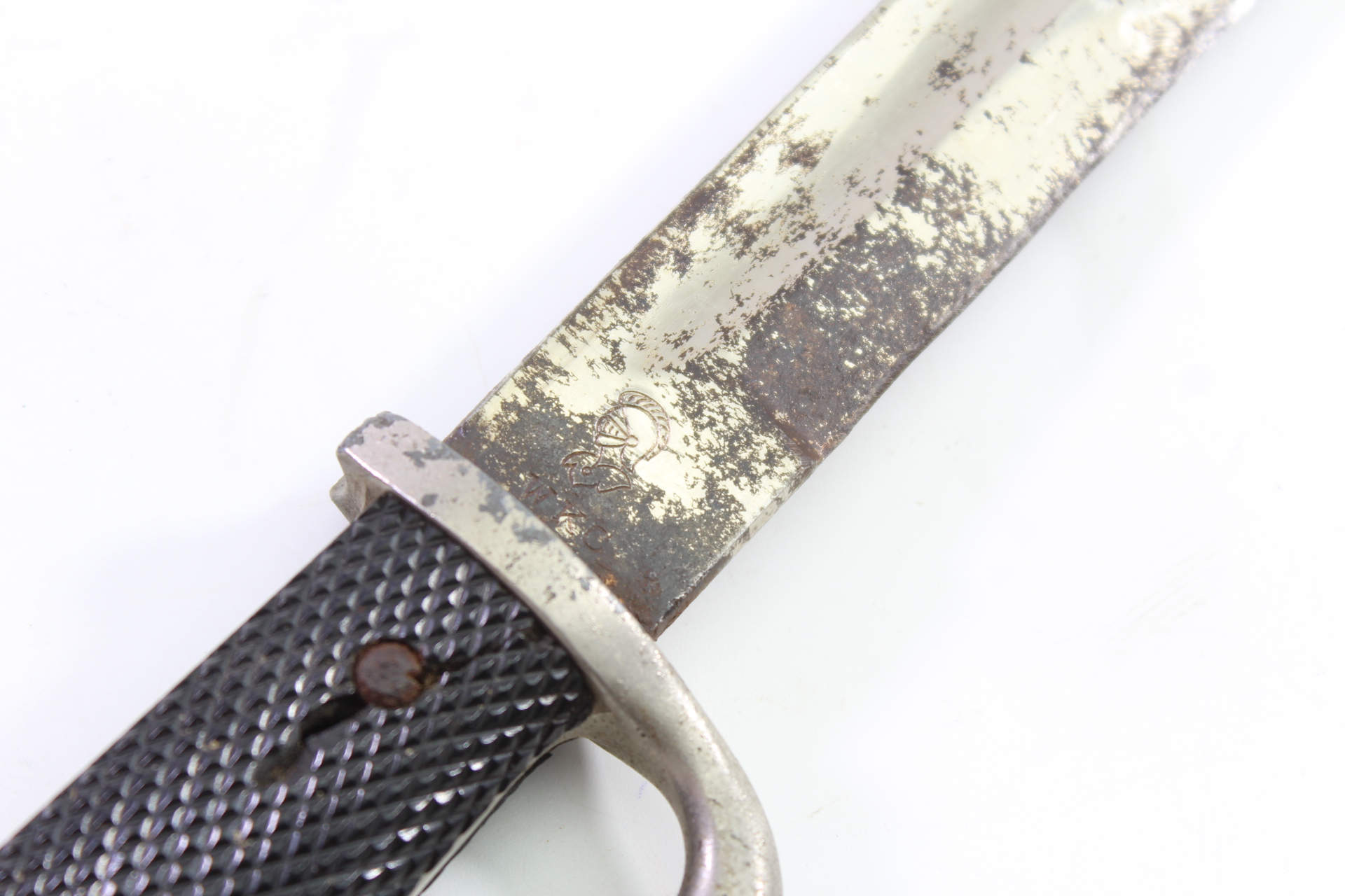Klingenlänge 25 cm Gesamtlänge 40cm, Griff ist an einer Niete beschädigt, Klinke wackelt etwas am Griff, Klinge im stark gebrauchten Zustand. Klinge und Koppelschuh im guten Zustand.