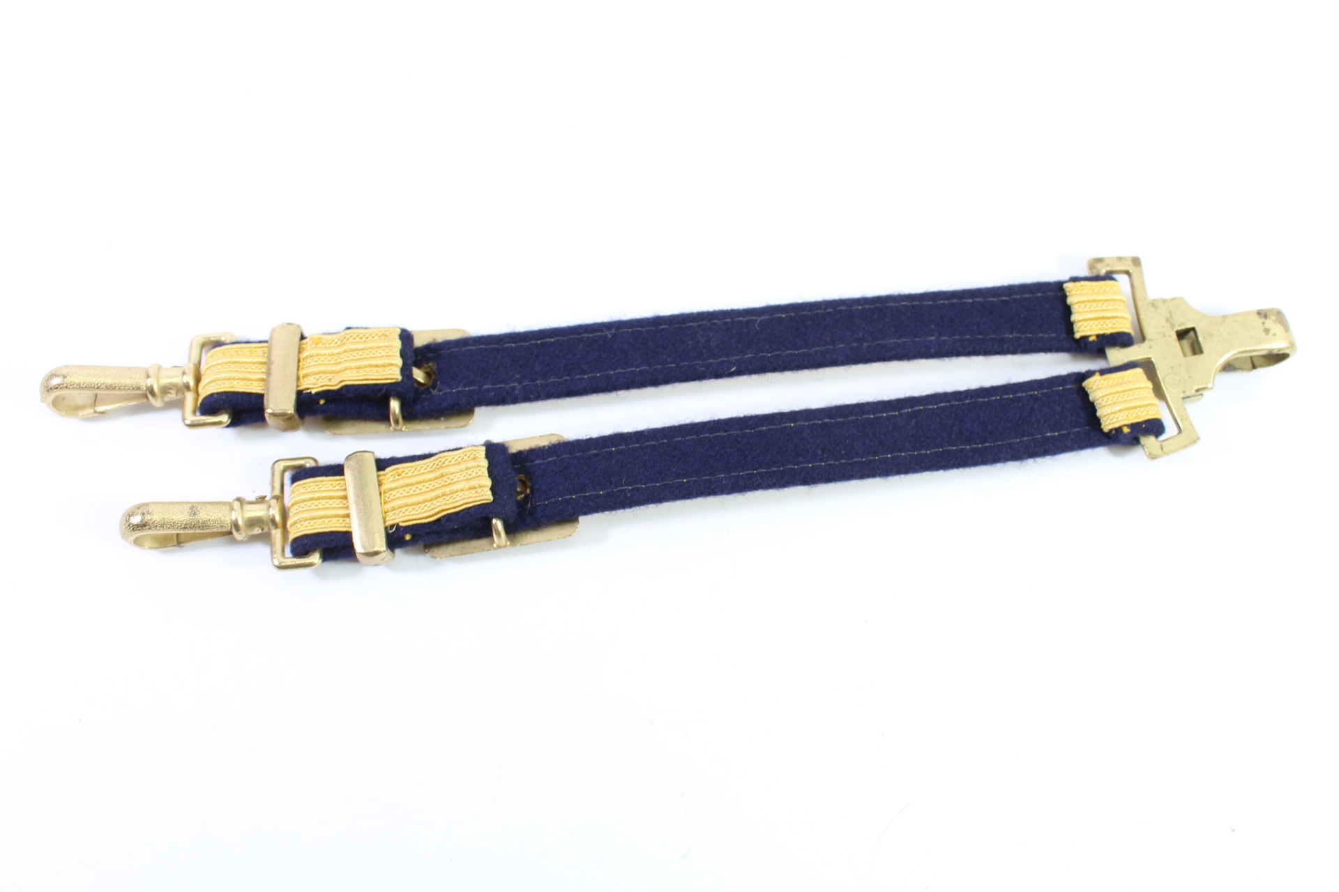 zweischneidige doppelt gekehlte gerade Klinge mit Nummer 06761 im grünen Karton, mit Kunststoffgriff, Knauf und Parierstange vergoldet, Parierstange leicht s-förmig mit Eicheln an beiden Enden, getragenes Stück, Vergoldung teilweise berieben, schwarz lackierte Eisenscheide mit zwei vergoldeten Beschlägen und zwei Trageringen, oberer Beschlag mit reliefiertem Staatswappen und Eichenblatt,
