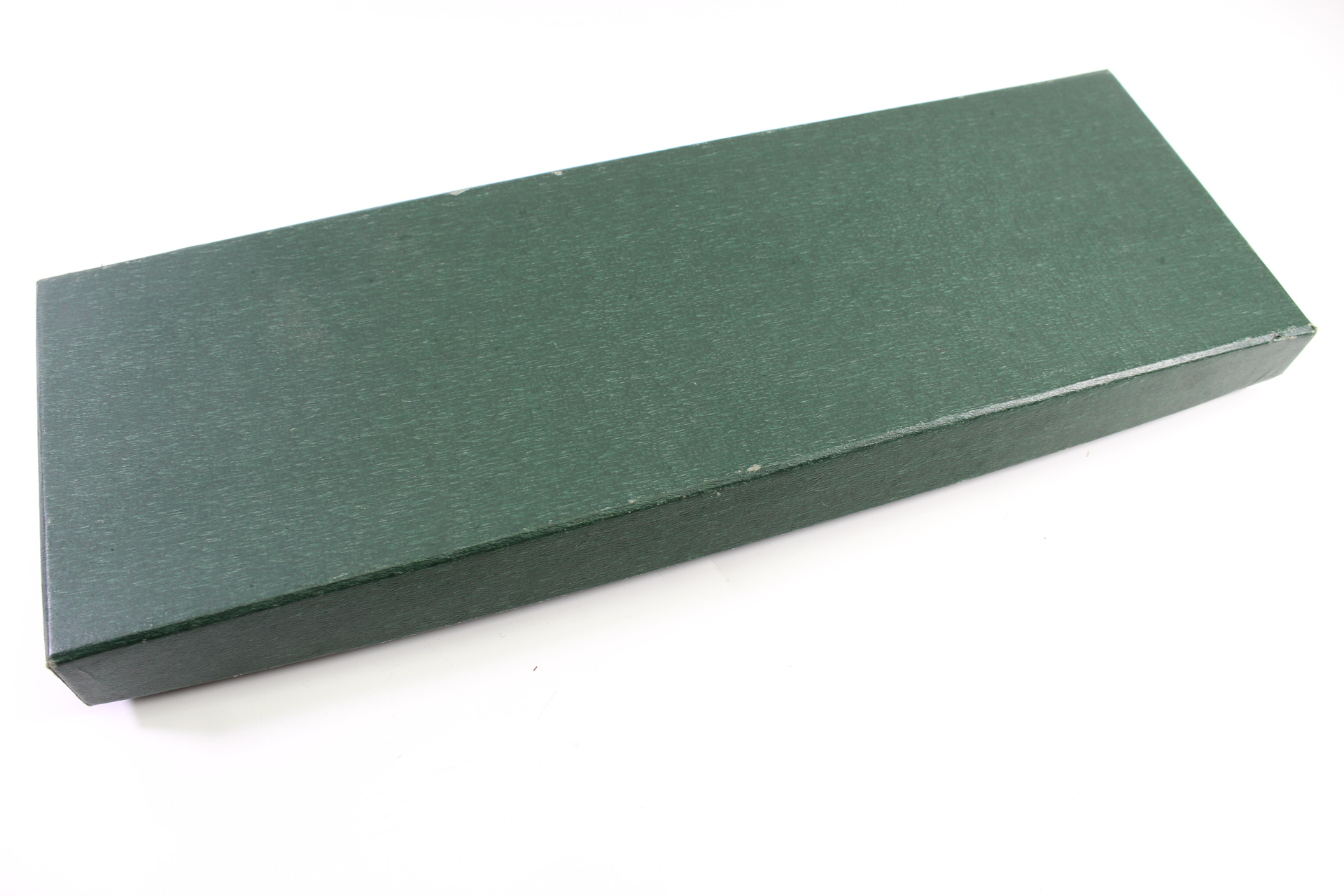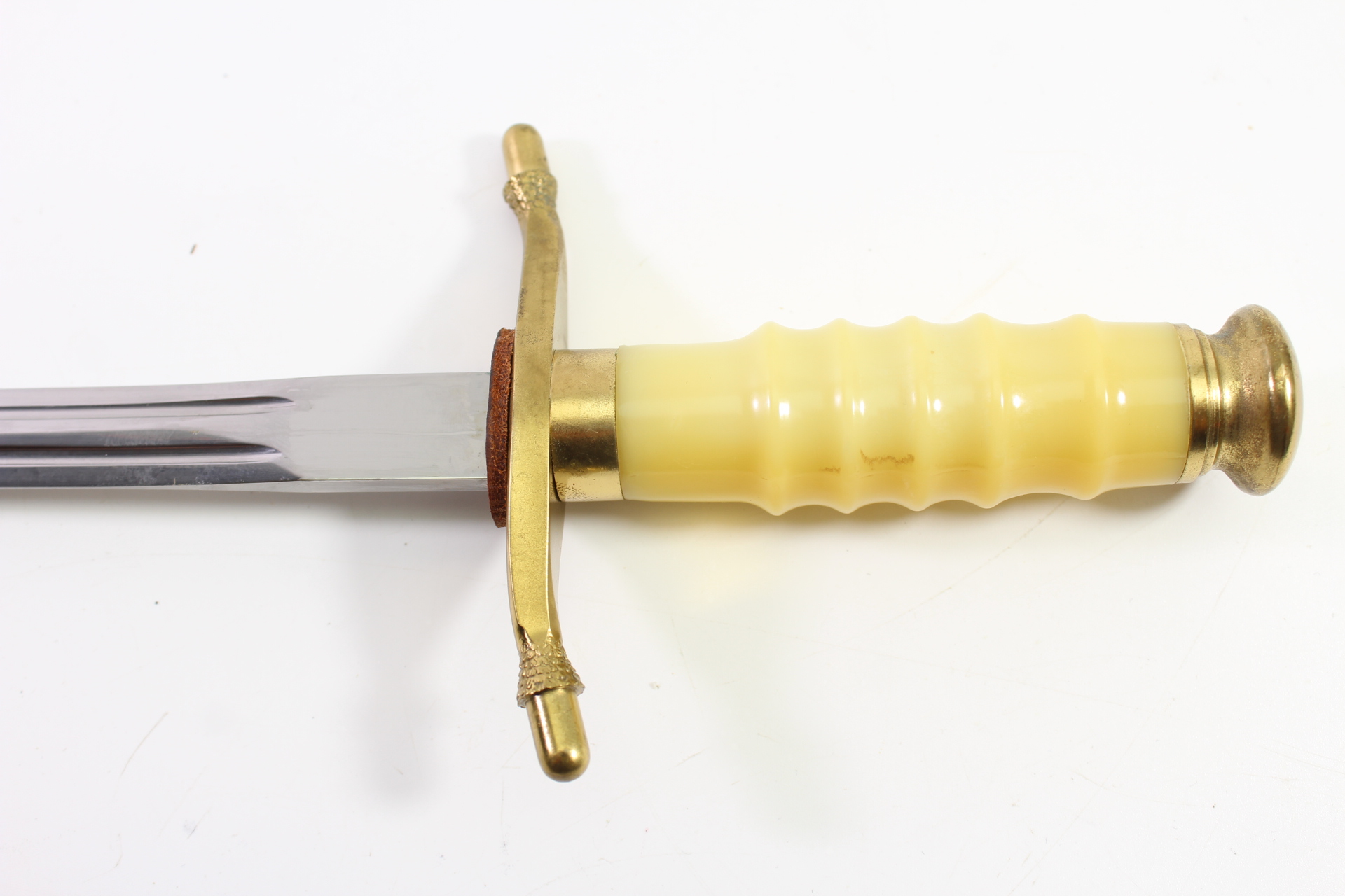 Double-edged, double-fullered straight blade with number 03185 in a green cardboard box. Plastic handle, gold-plated pommel and crossguard, slightly S-shaped crossguard with acorns at both ends.