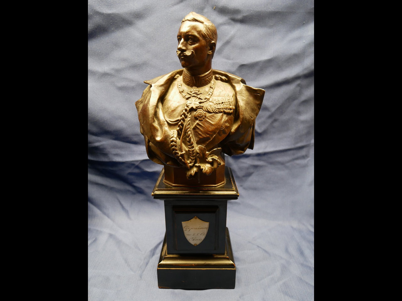 Bronzierte Büste mit Bildnis von Kaiser Wilhelm II auf Holzsockel mit Plakette "Offizierschiessen am 5.8.03 1.Preis"